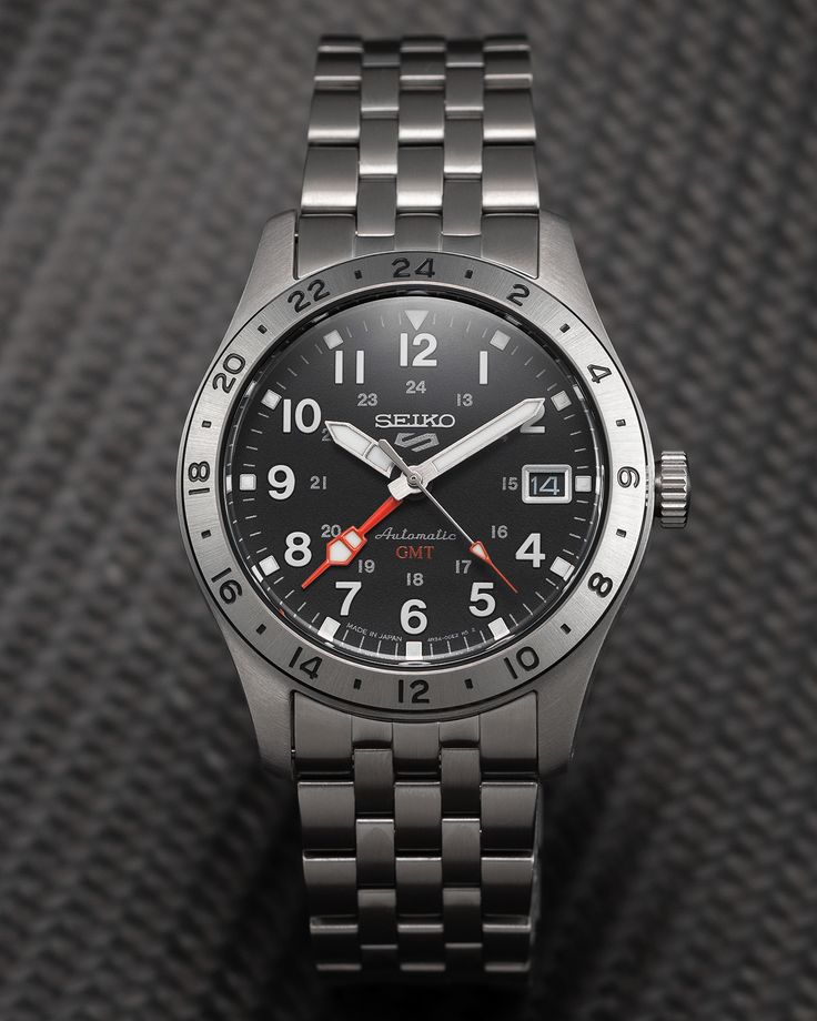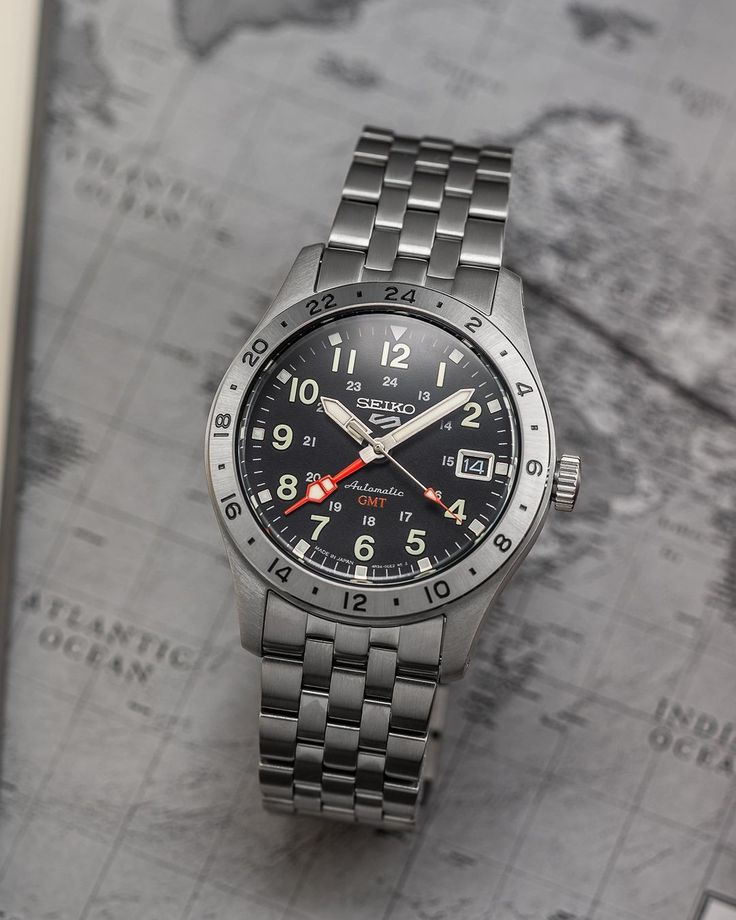 Diseñado para aventureros y viajeros, este GMT automático combina caja y brazalete de acero inoxidable con un bisel 24 horas para seguimiento de doble zona horaria. Su esfera negra ofrece legibilidad óptima gracias a marcadores y agujas luminiscentes, mientras la aguja GMT roja añade carácter y funcionalidad. Impulsado por un fiable calibre automático 4R34 con reserva de marcha de 41 horas, es una pieza robusta y elegante que lleva la tradición de Seiko a cada destino.